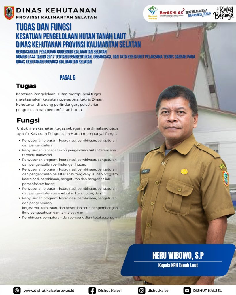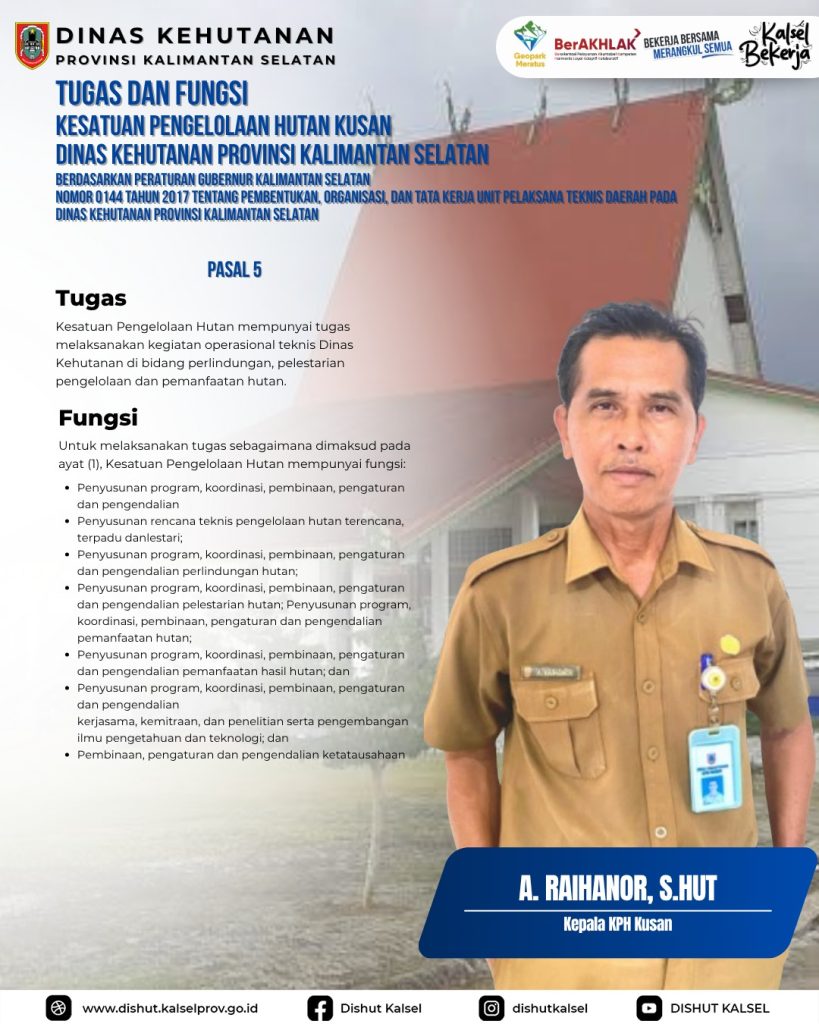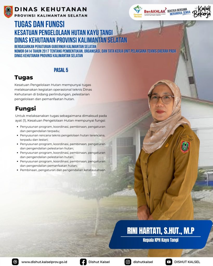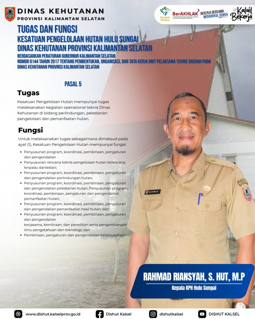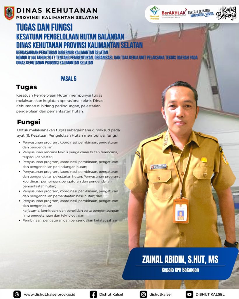 KPHP Tabalong KPHL Balangan KPHL Hulu Sungai KPHP Tanah Laut KPHP Kusan KPHP Cantung KPHP Pulau Laut Sebuku KPHL Sengayam KPH Kayu Tangi Unit Pelaksana Teknis Daerah – Dinas Kehutanan Provinsi Kalimantan Selatan Taman Hutan Raya Sultan Adam Balai Perbenihan Tanaman Hutan – Dinas Kehutanan Provinsi Kalimantan Selatan