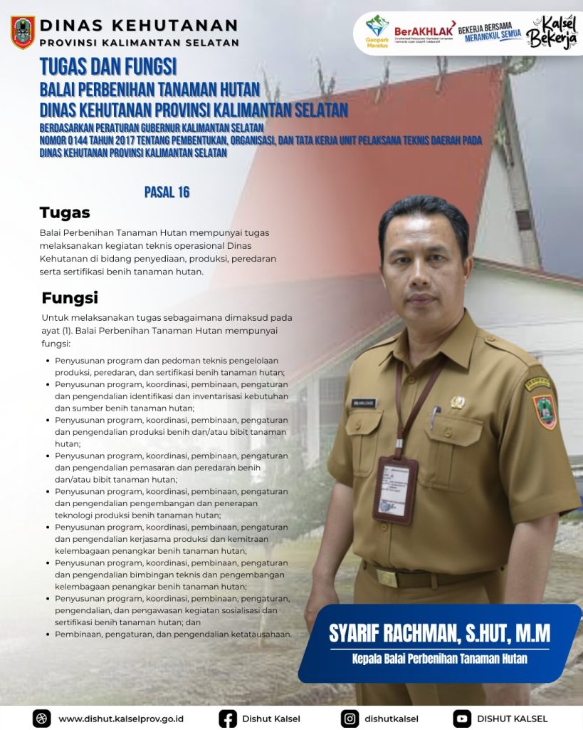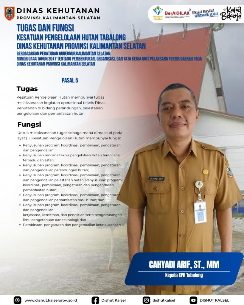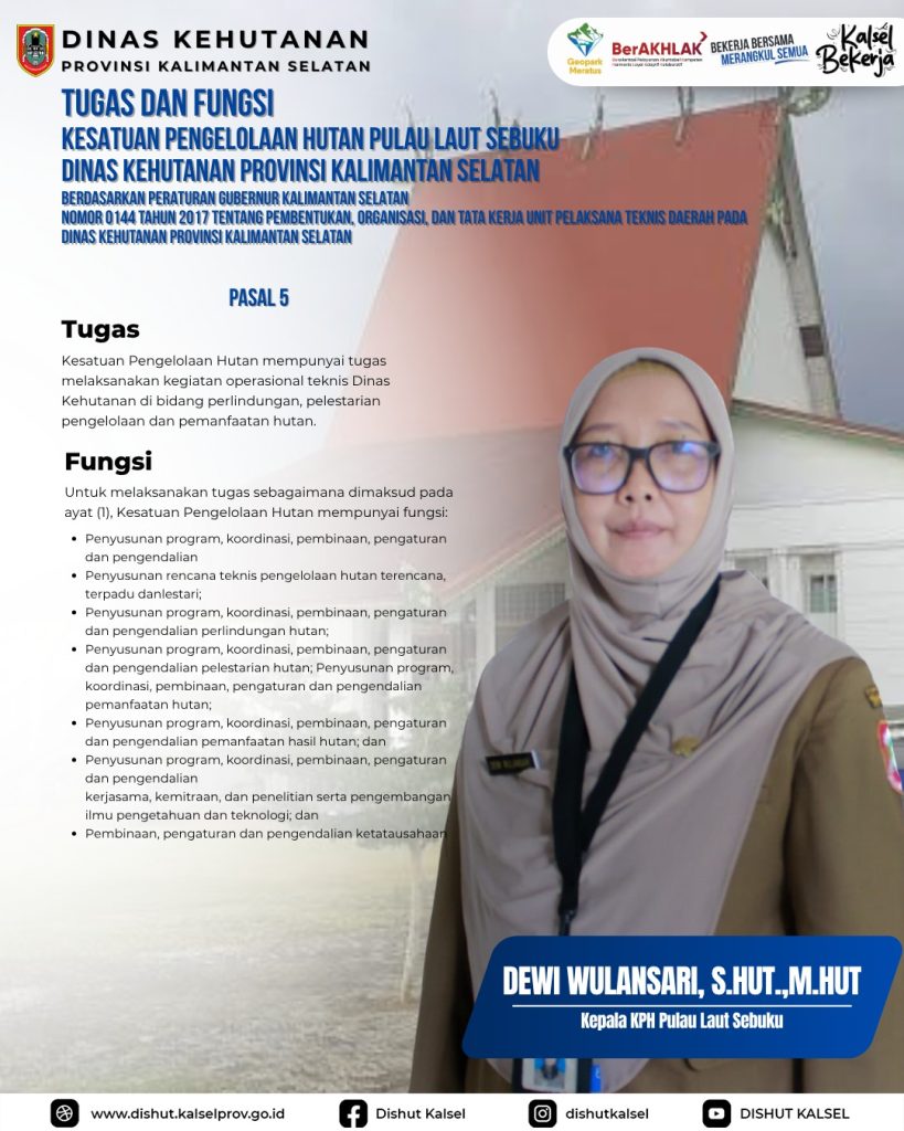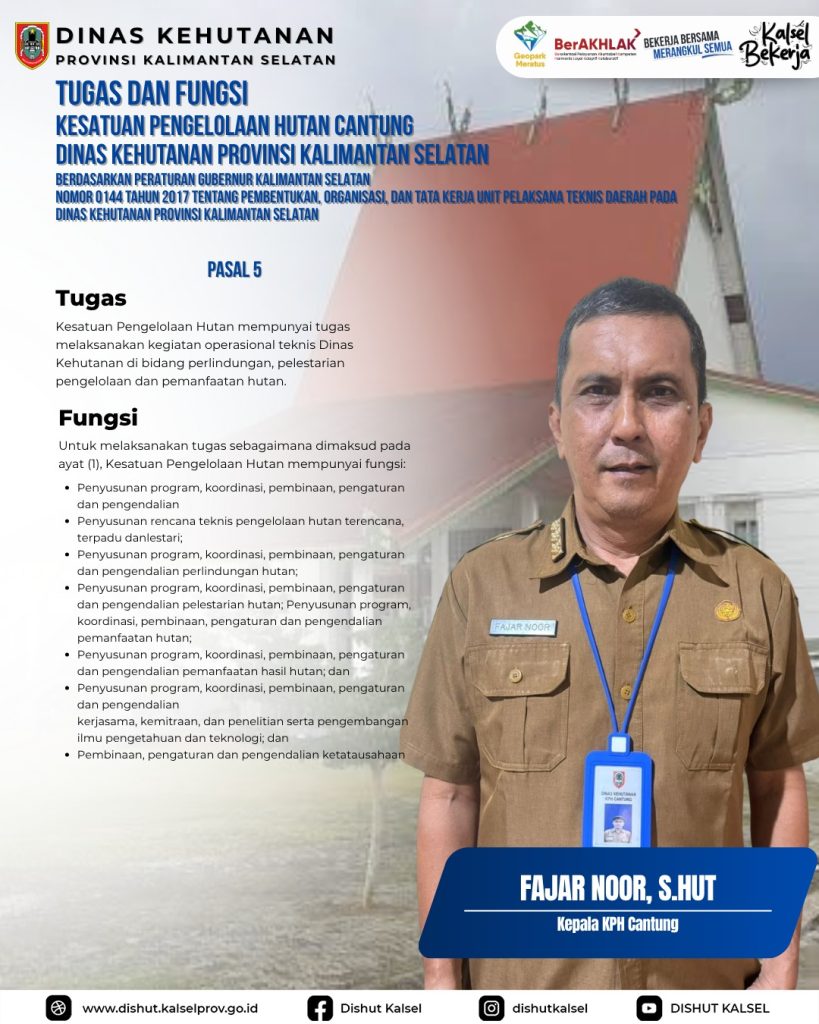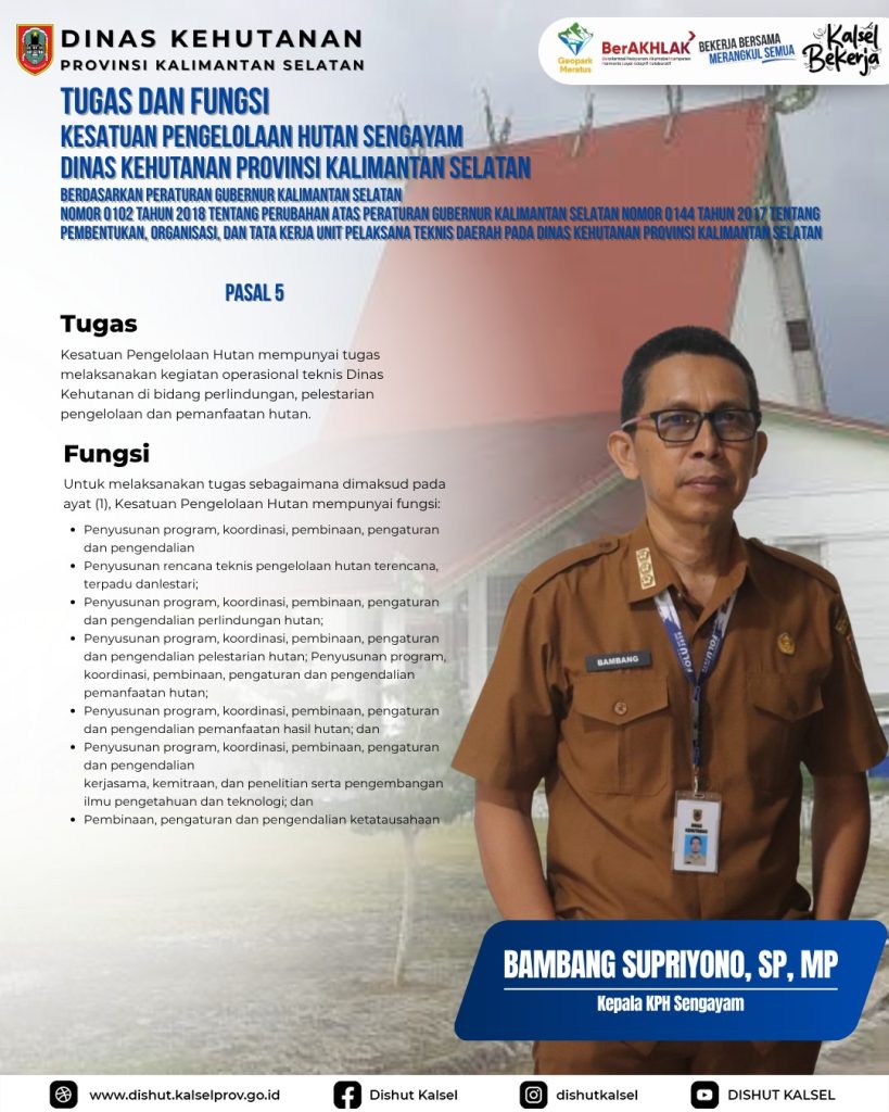 KPHP Tabalong KPHL Balangan KPHL Hulu Sungai KPHP Tanah Laut KPHP Kusan KPHP Cantung KPHP Pulau Laut Sebuku KPHL Sengayam KPH Kayu Tangi Unit Pelaksana Teknis Daerah – Dinas Kehutanan Provinsi Kalimantan Selatan Taman Hutan Raya Sultan Adam Balai Perbenihan Tanaman Hutan – Dinas Kehutanan Provinsi Kalimantan Selatan