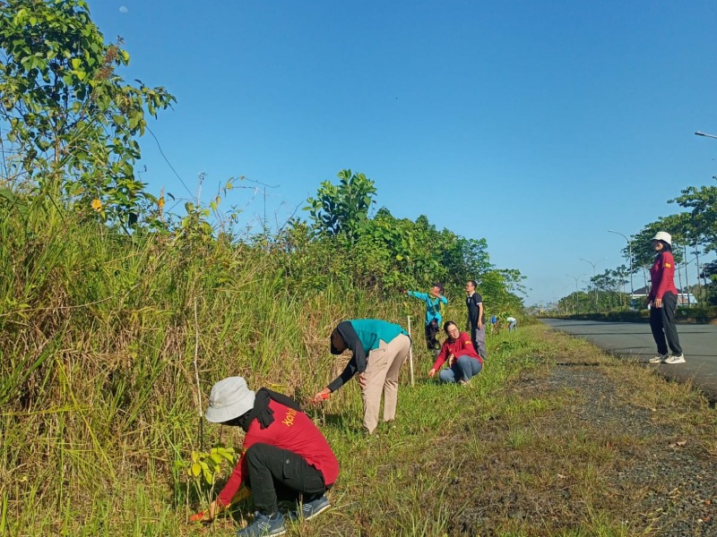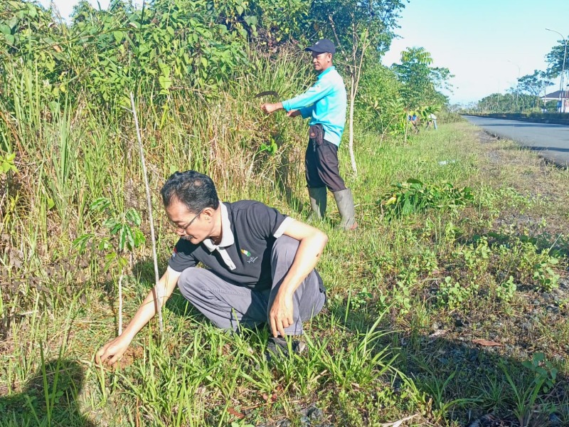 Melaksanakan kegiatan pemliharaan tanaman kakija berupa penyiangan tanaman dan pendangiran, di ikuti karyawan/ti KPH Kusan.